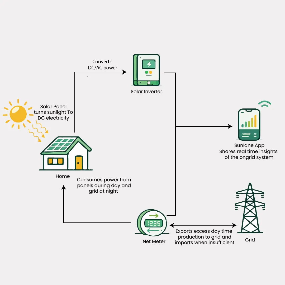 Most common and affordable for homes, on-grid solar is solar connected to the grid.